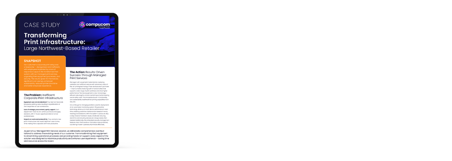 As part of our Managed Print Services solution, we deliver a comprehensive overhaul tailored to address the evolving needs of our customers. From modernizing their equipment to streamlining operational processes and providing hands-on support, every aspect of the solution is designed to maximize productivity and enhance user experience — saving time and resources across the board.